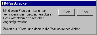 TB-Bitrate Calculator TB-Cag TB-ChangeLogos98 TB-Chat TB-ClearAll TB-FileSplitt TB-IconSearch TB-JumpOver TB-NetStarter TB-Network TB-Paper TB-PassCracker TB-PizzaTimer TB-Promillemesser TB-RollUp TB-Rowse TB-ScreenLock TB-Shortcut TB-Sleeper TB-SmileyGame TB-TaskManager TB-TextCipher TB-Zufallszähler |